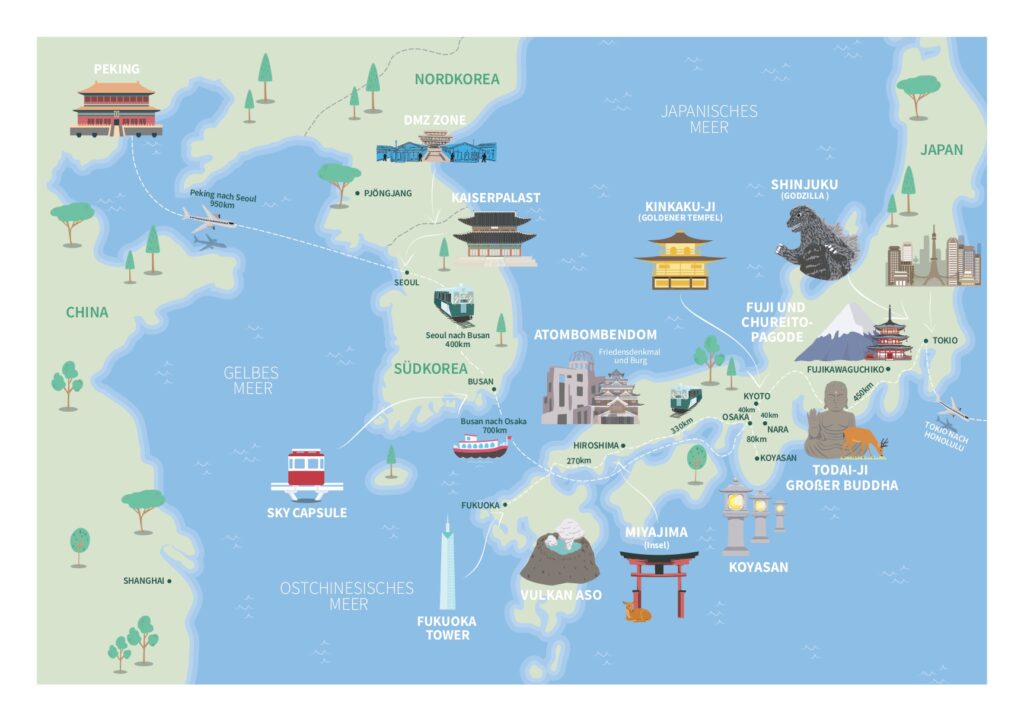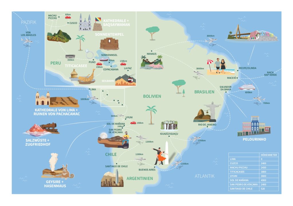 So erzählt es von halbautomatisierten Restaurants und ungezählten Mauern in China, von zahmen Hirschen und heiligen Schnipseln in Japan, von Höhenkrankheit in den Anden und Fata Morganas in der Salzwüste, von Cocktails an der Copacabana und Nächten im brasilianischen Regenwald — und von Gehversuchen im Mikrokosmos Kreuzfahrtschiff zwischen den Kontinenten.